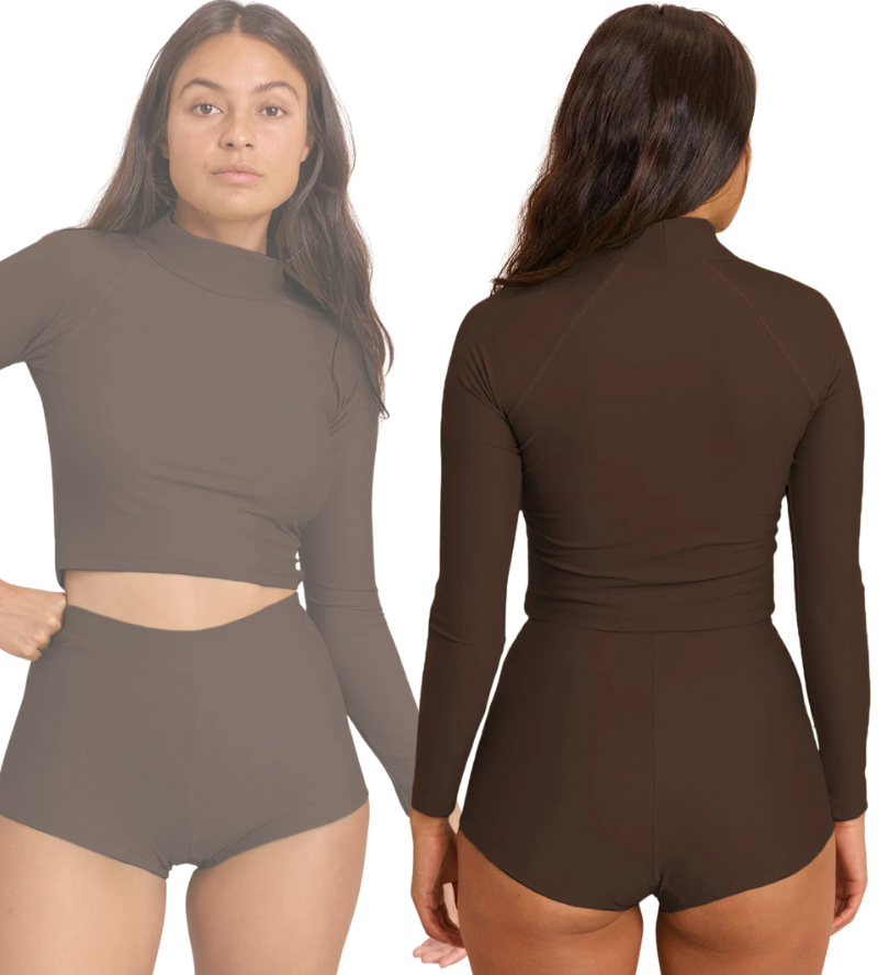 My favorite combo. I like my legs free for some sun and fun and I like being covered on top for extra sun protection. These pieces are SPF 50. High neck. Quick dry. I stay a little warmer and it can be hot on really sunny days but it just makes me hop in the water more.